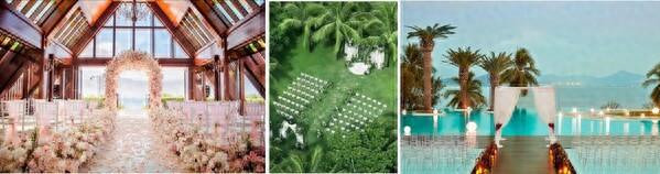 从左至右:三亚亚龙湾万豪度假酒店的“海之恋”婚礼堂、三亚海棠湾JW万豪度假酒店的椰林草坪、三亚山海天大酒店傲途格精选的玻璃水台